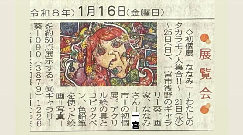 会期:2026.1.21 - 1.25 (10:00 - 16:00) [ななみ在廊日]21.24.25 会場:ギャラリー 葵 一宮市浅野字駒寄12-2(090-3879-1226)
