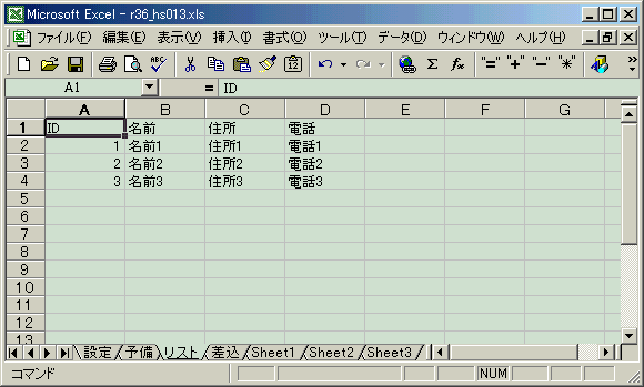 【1】自作オリジナルのリストデータを[予備シート]のセル(B1)を基点に貼り付けます。