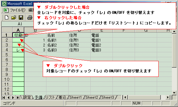 【2】[予備シート]のA列(印刷フィールド)が印刷レコードの選択枠になっています。