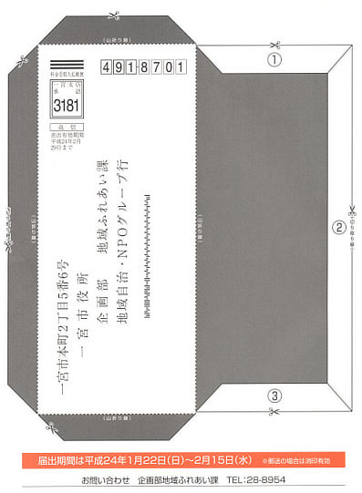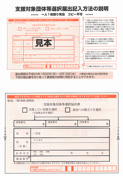 ▼市民活動支援制度 市民の選択届出受付(届出方法:20120126) ◆平成23年度 届出期間:平成24年1月22日(日)~2月15日(水) ※郵送の場合は期間内の消印有効 ◆届出対象者:平成24年1月1日現在において、一宮市の住民基本台帳に記録され、又は外国人登録原票に登録されている年齢18歳以上の方(平成6年1月2日以前に生まれた方)です。 ▼届出方法:支援したい団体を3つ以内選んで、下記のいずれかの届出方法により行ってください。