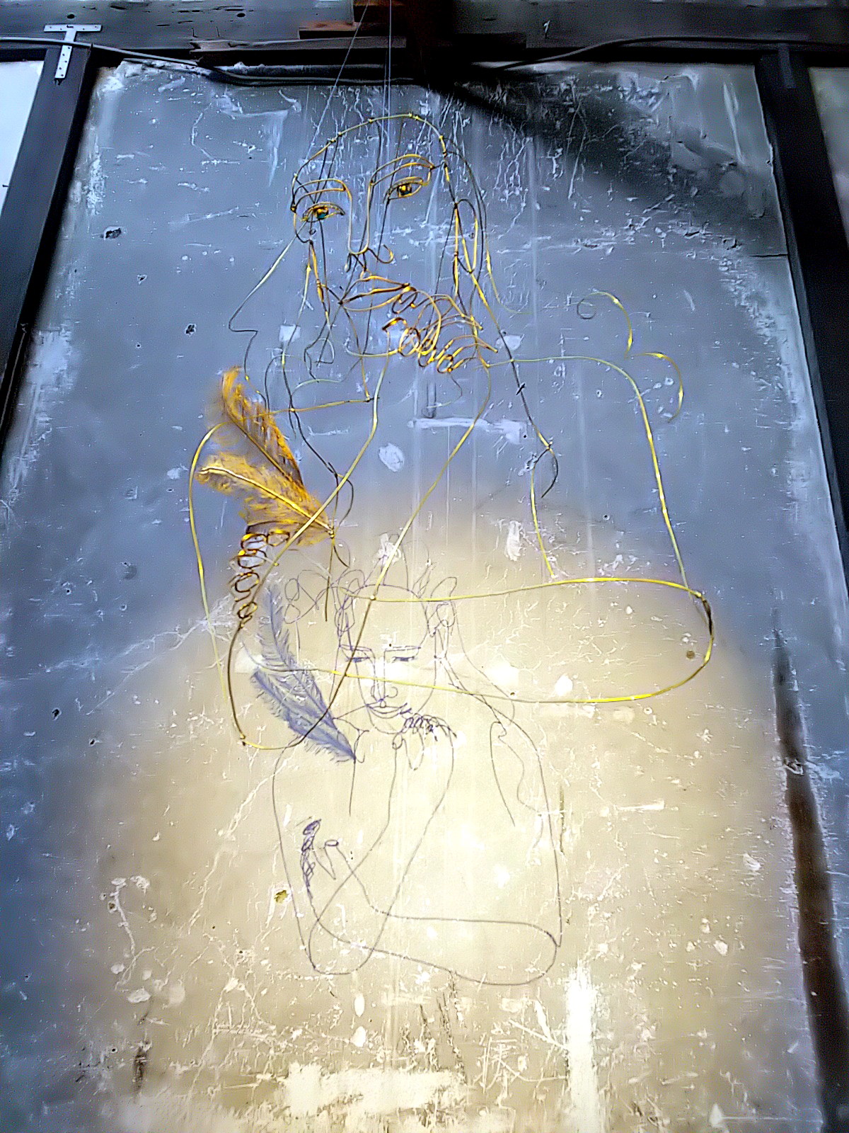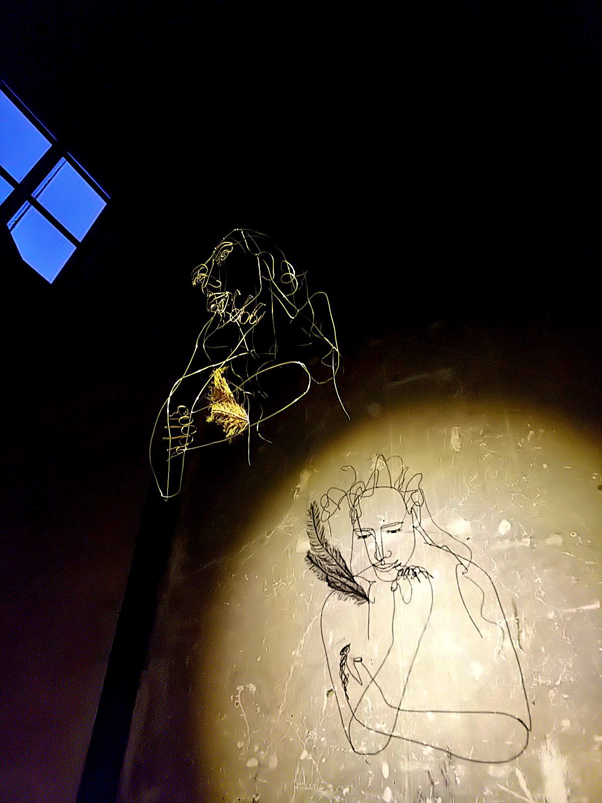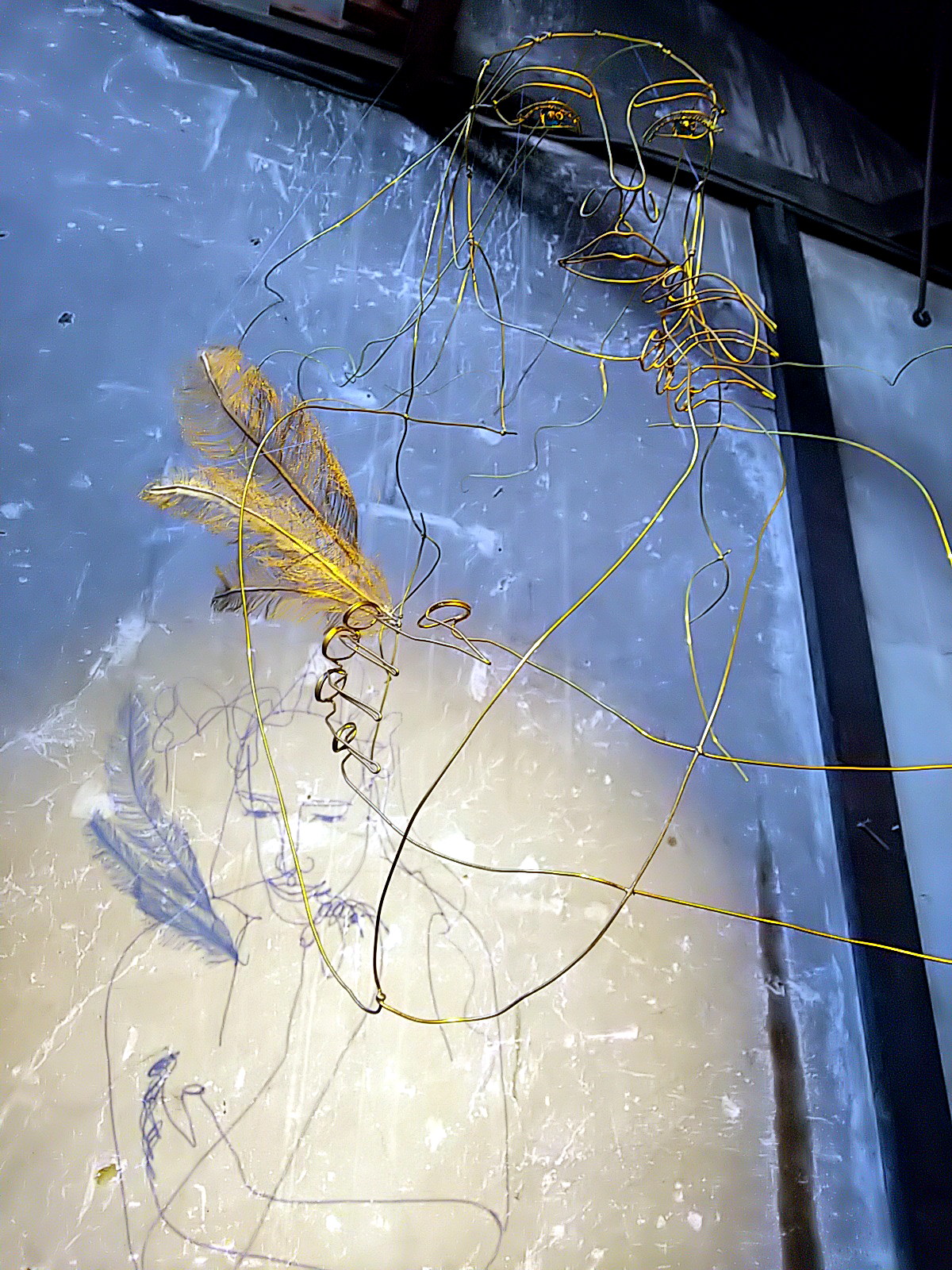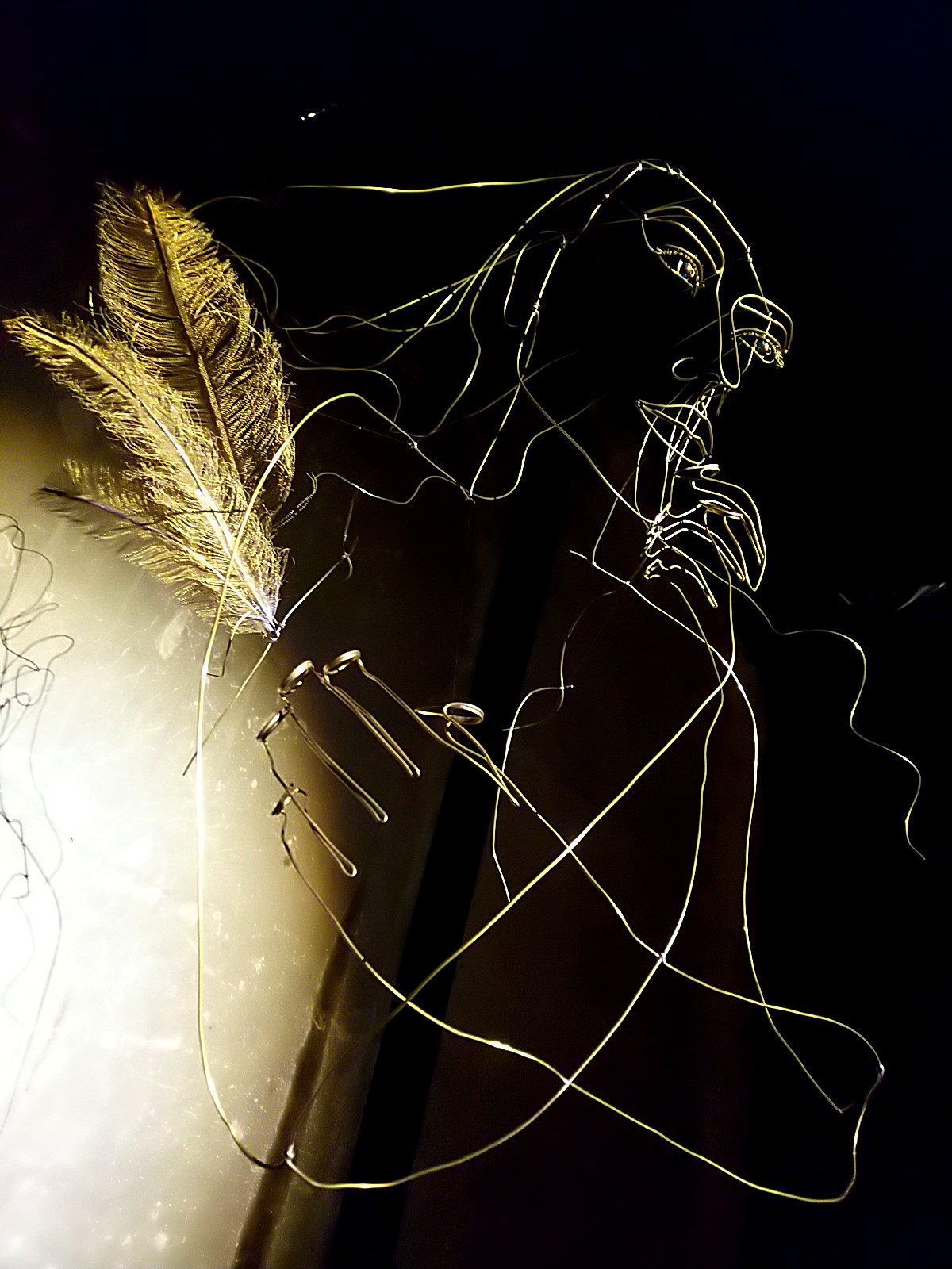 ワイヤーアートはテグスで吊られていますが、その支点により振り幅が微妙に異なっています。人物と翼の揺れ幅が異なるのです。これによって、影に映し出される映像は、人物は静止していても、翼だけが揺れて見える、妙。実際は、立体のワイヤーアート自体は全体が揺れている。微妙に揺れ幅を違えながら。