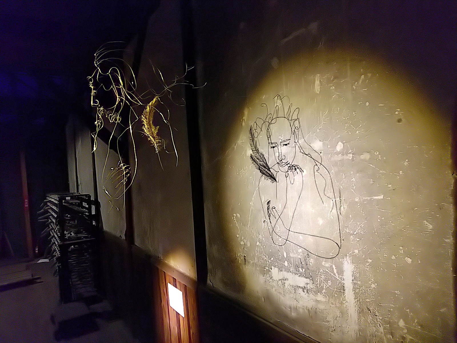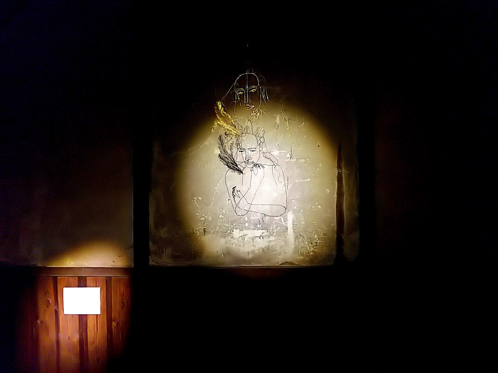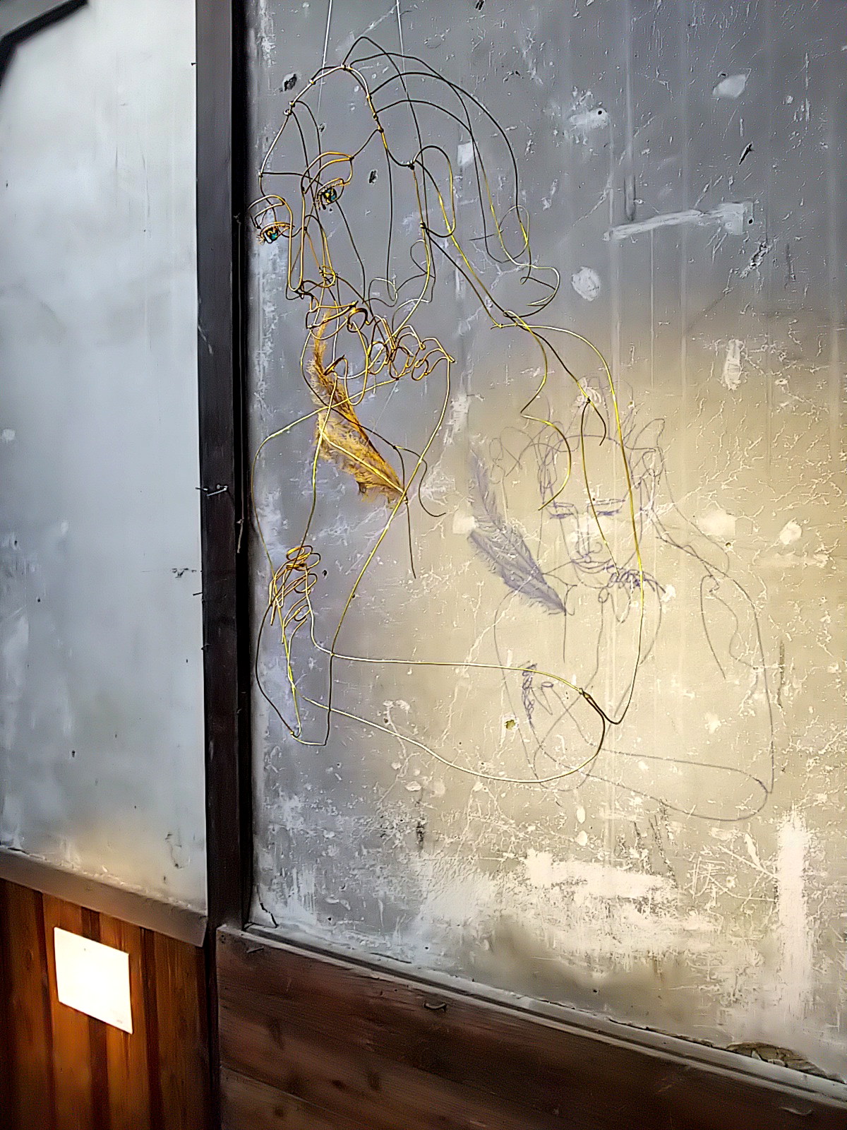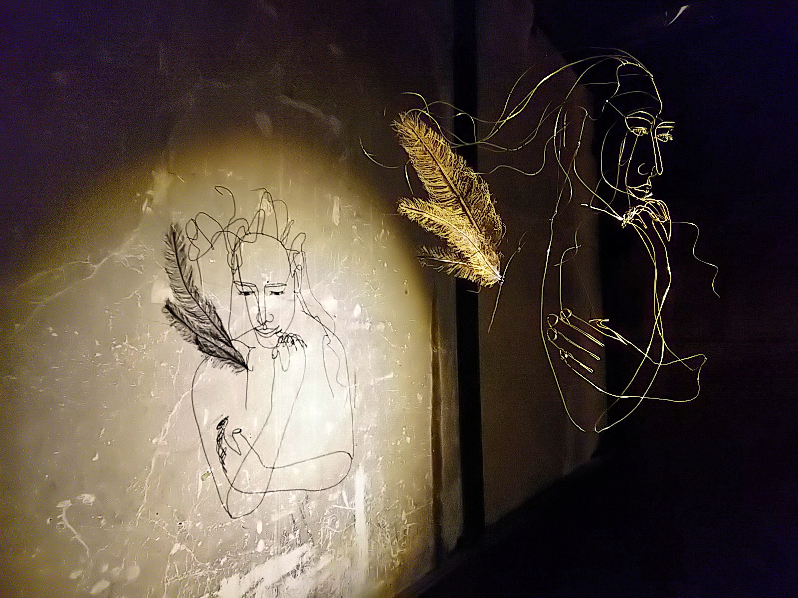 ワイヤーアートはテグスで吊られていますが、その支点により振り幅が微妙に異なっています。人物と翼の揺れ幅が異なるのです。これによって、影に映し出される映像は、人物は静止していても、翼だけが揺れて見える、妙。実際は、立体のワイヤーアート自体は全体が揺れている。微妙に揺れ幅を違えながら。