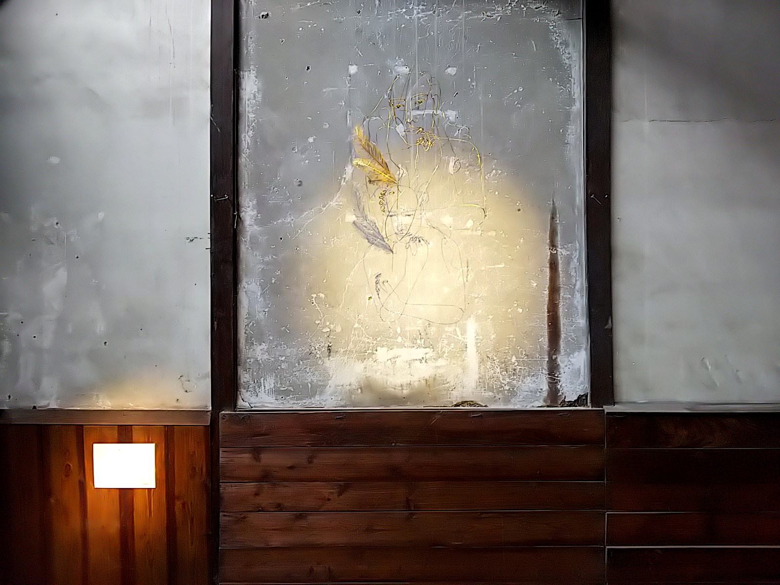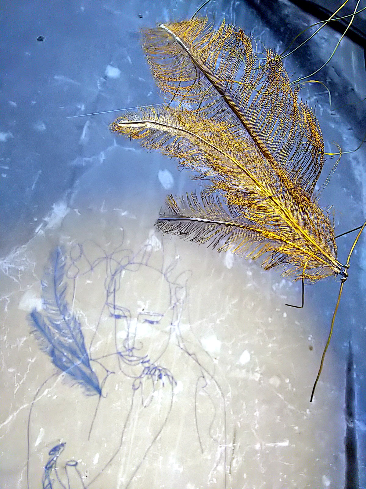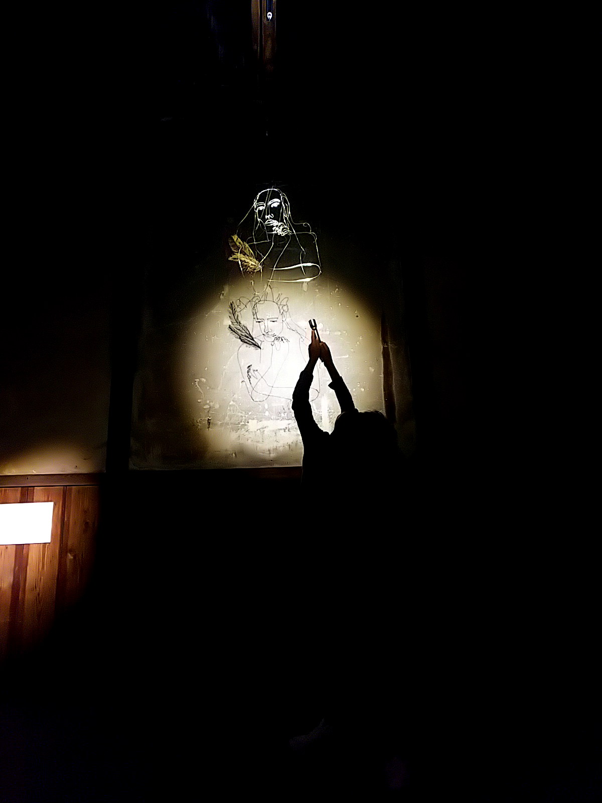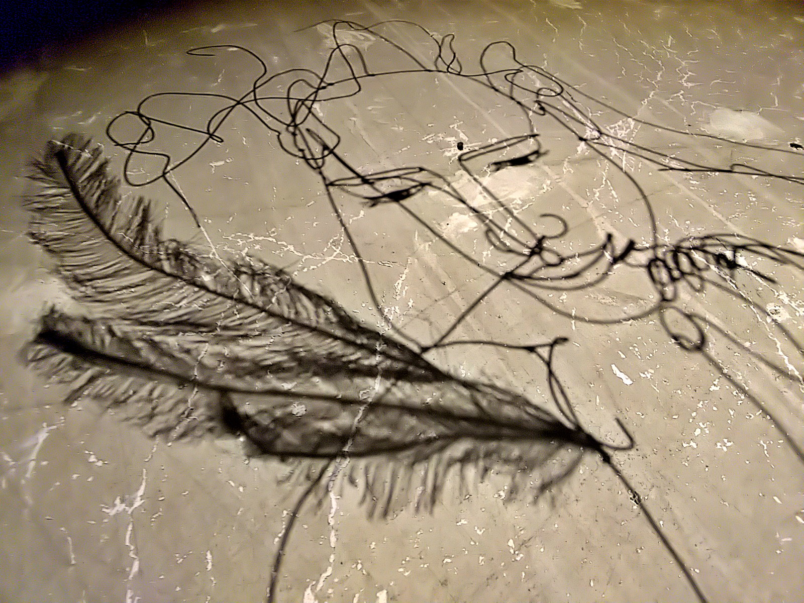 ワイヤーアートはテグスで吊られていますが、その支点により振り幅が微妙に異なっています。人物と翼の揺れ幅が異なるのです。これによって、影に映し出される映像は、人物は静止していても、翼だけが揺れて見える、妙。実際は、立体のワイヤーアート自体は全体が揺れている。微妙に揺れ幅を違えながら。