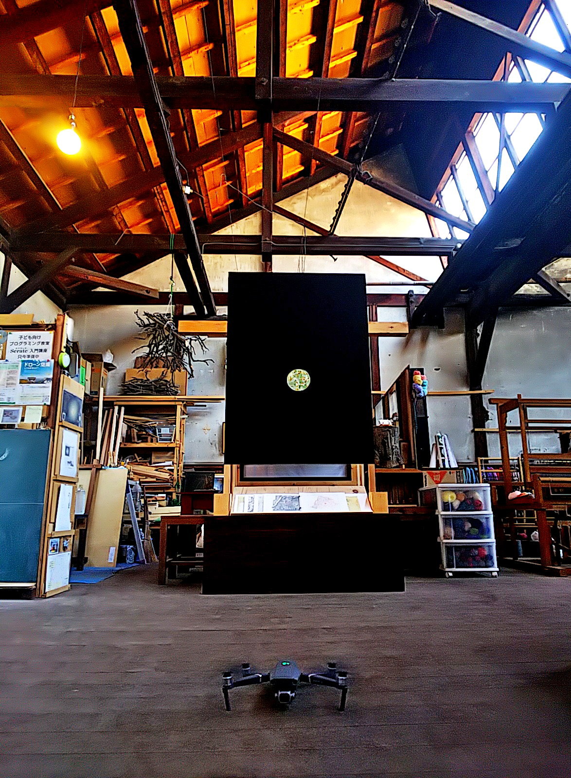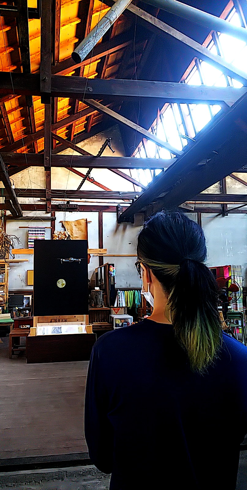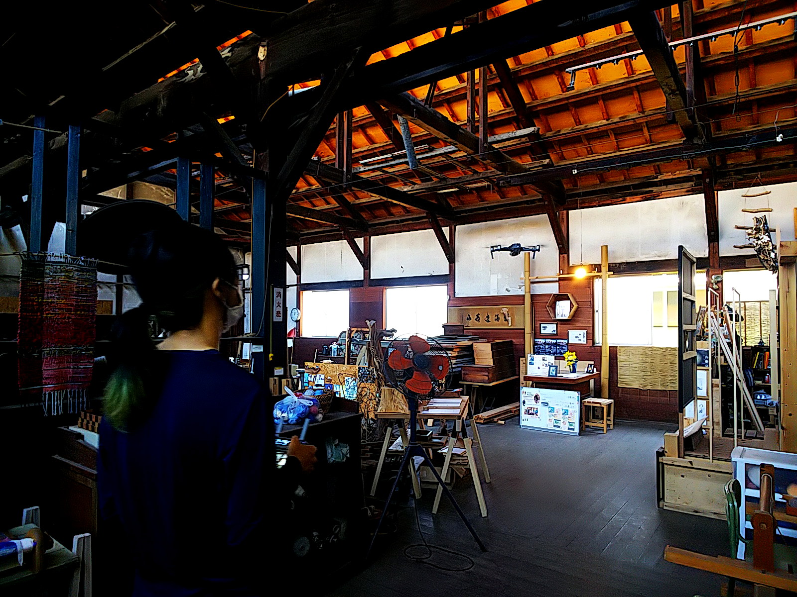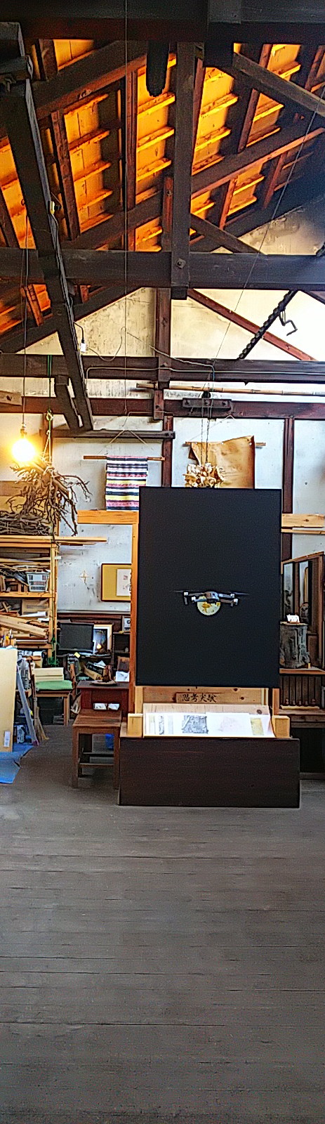 マスミダカラスの「眼」となったドローン。「のこぎりニ」の上空から“ノコギリヤネ”を捕らえると、開かれた西扉から工場内へと進入します。工場内を見渡した後、「ノコギリアン文庫フェア」の展示がある工房エリア(二坪の眼)へと向かいます。メイン展示の『ノコギリヤネ100年マップ』を見つけると、まずは“まれびと”(サカオ・ケンジ氏作)と向き合います。そして、暗黒扉の空欠から『ノコギリヤネ100年マップ』を見据えます。さらに、ノコギリアンコウバに展示してある“アートブック”の展示舞台に視線します。観賞を終えたマスミダカラスの「眼」は、ションヘル織機の脇を飛び進み、開かれた工場の東扉から屋外へと飛び去っていったのでした。
