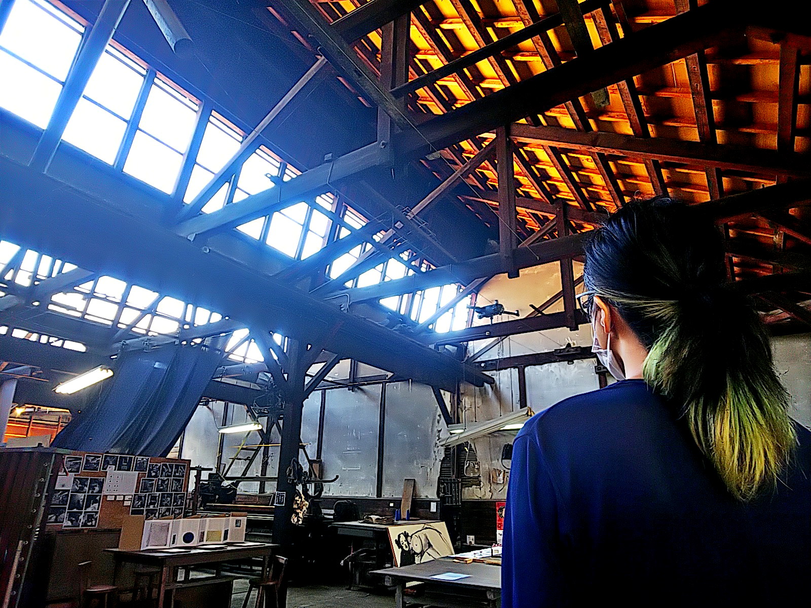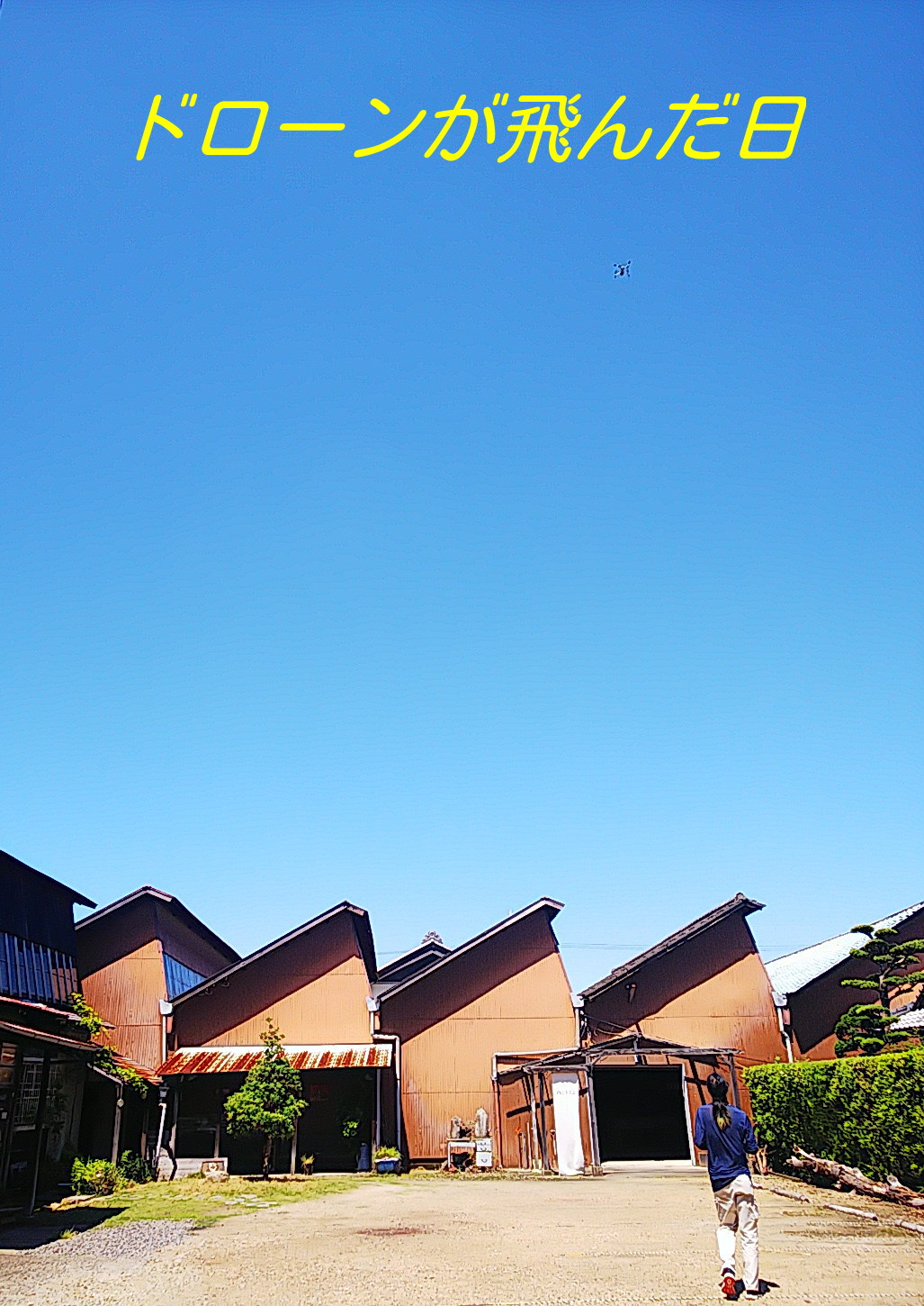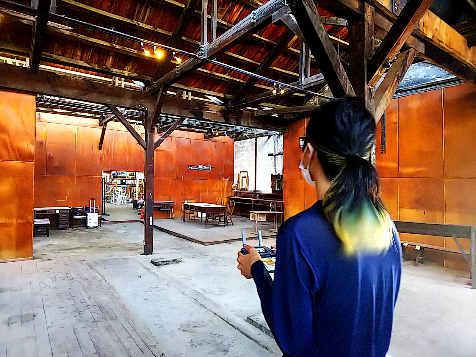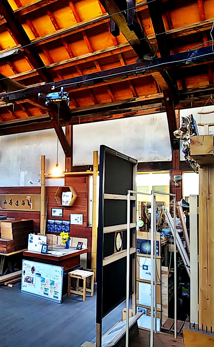 マスミダカラスの「眼」となったドローン。「のこぎりニ」の上空から“ノコギリヤネ”を捕らえると、開かれた西扉から工場内へと進入します。工場内を見渡した後、「ノコギリアン文庫フェア」の展示がある工房エリア(二坪の眼)へと向かいます。メイン展示の『ノコギリヤネ100年マップ』を見つけると、まずは“まれびと”(サカオ・ケンジ氏作)と向き合います。そして、暗黒扉の空欠から『ノコギリヤネ100年マップ』を見据えます。さらに、ノコギリアンコウバに展示してある“アートブック”の展示舞台に視線します。観賞を終えたマスミダカラスの「眼」は、ションヘル織機の脇を飛び進み、開かれた工場の東扉から屋外へと飛び去っていったのでした。