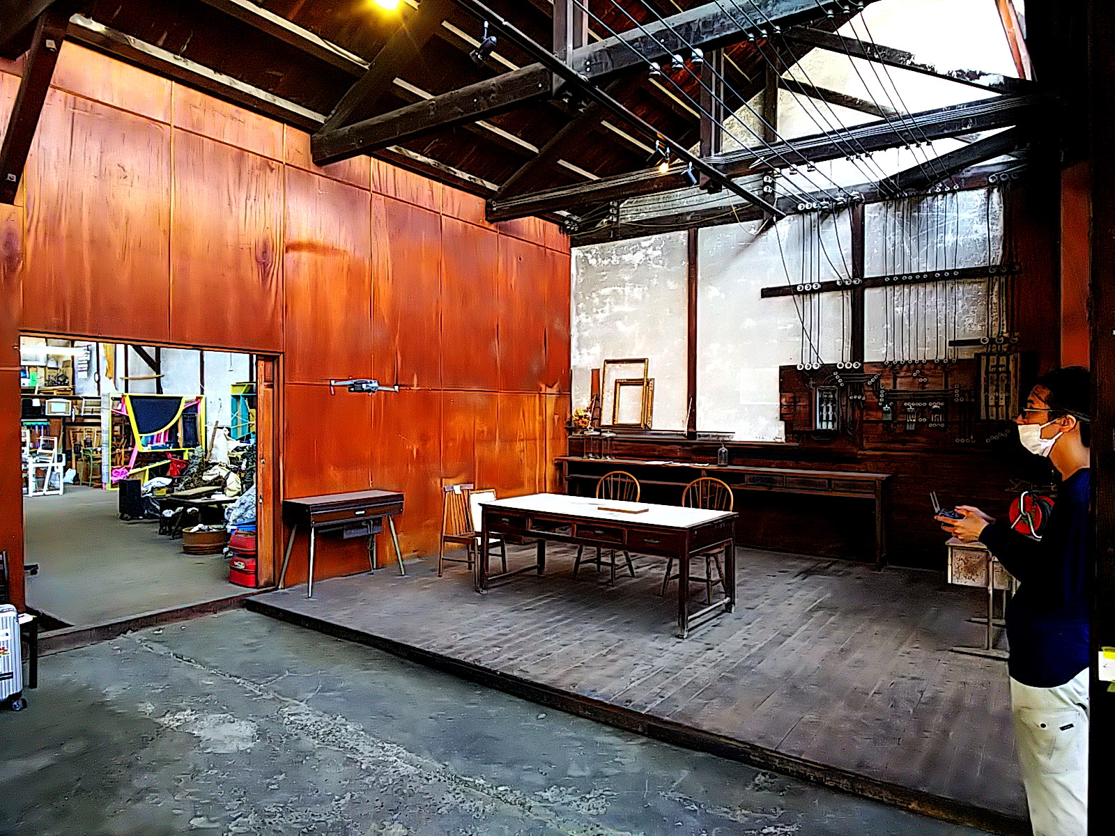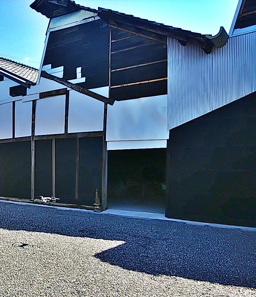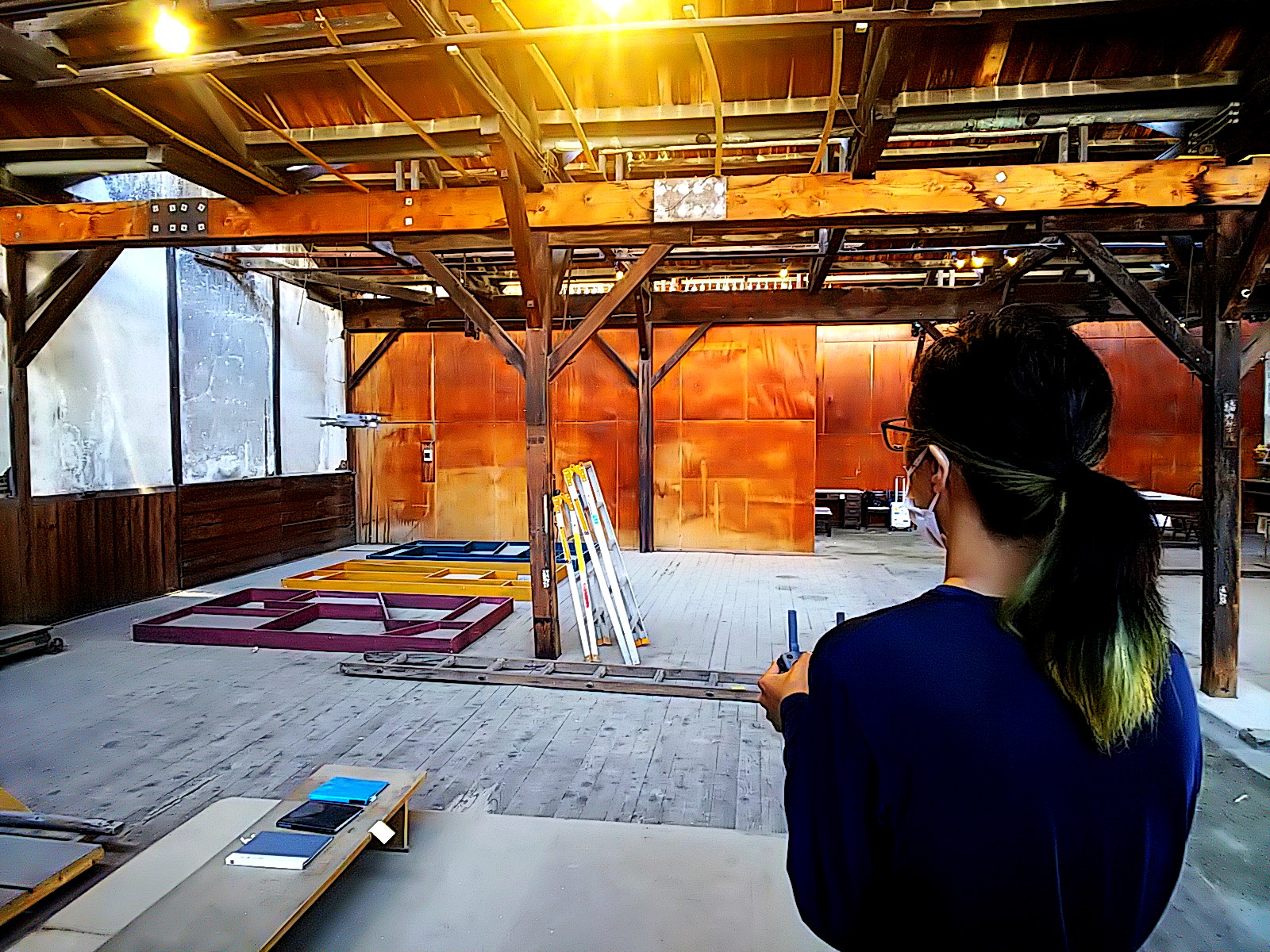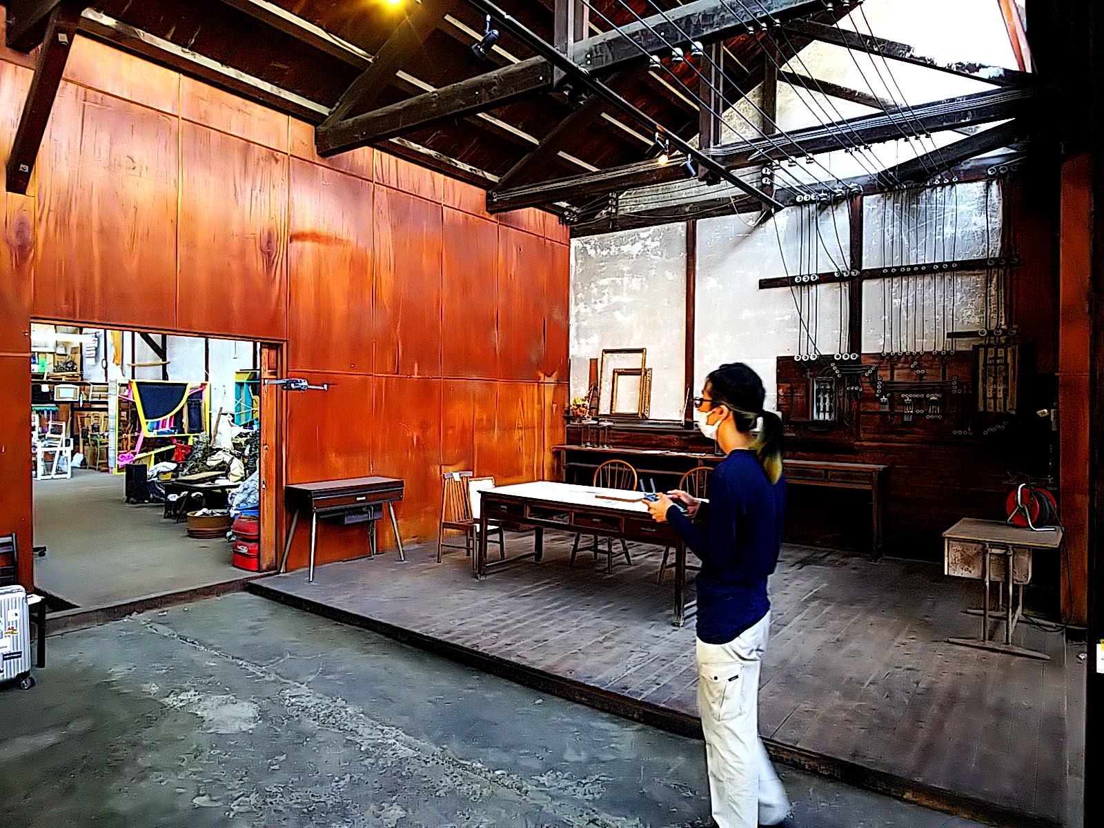 マスミダカラスの「眼」となったドローン。「のこぎりニ」の上空から“ノコギリヤネ”を捕らえると、開かれた西扉から工場内へと進入します。工場内を見渡した後、「ノコギリアン文庫フェア」の展示がある工房エリア(二坪の眼)へと向かいます。メイン展示の『ノコギリヤネ100年マップ』を見つけると、まずは“まれびと”(サカオ・ケンジ氏作)と向き合います。そして、暗黒扉の空欠から『ノコギリヤネ100年マップ』を見据えます。さらに、ノコギリアンコウバに展示してある“アートブック”の展示舞台に視線します。観賞を終えたマスミダカラスの「眼」は、ションヘル織機の脇を飛び進み、開かれた工場の東扉から屋外へと飛び去っていったのでした。