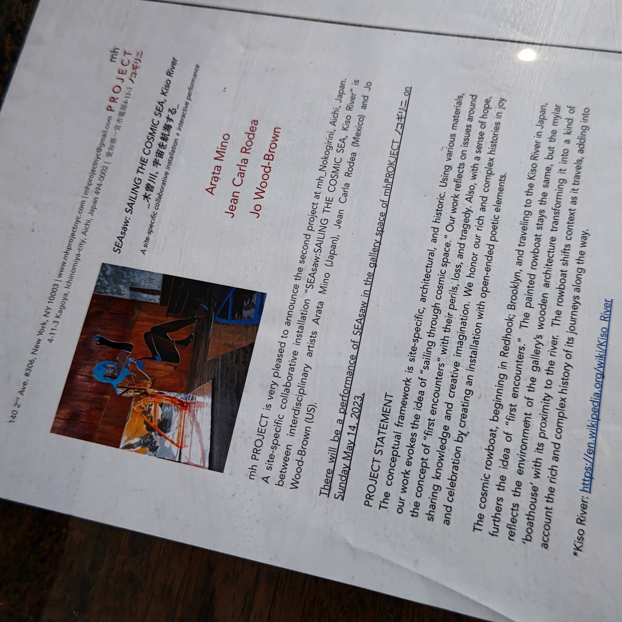 SAILING THE COSMIC SEA, Kiso River Arata Mino Jean Carla Rodea Jo Wood-Brown mh PROJECT ノコギリニ:https://mhprojectnyc.com/SEAsaw mh PROJECT_ノコギリニ (Nokogirini)はインターディシプリナリーアーティスト、三野新(日本)、ジーン・カーラ・ロデア(メキシコ)、ジョー・ウッド-ブラウン(米国)による共同プロジェクト、サイトスペシフィック−インスタレーション『SEAsaw:木曽川、宇宙を航海する』を開催いたします。 2023年5月14日(日)16時 photo record |