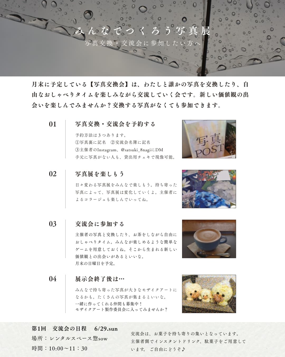 写真という媒体を通して、普段の生活のなかでは出会えなかった感情・価値観・人に出会う場所を作りたいと思っています。