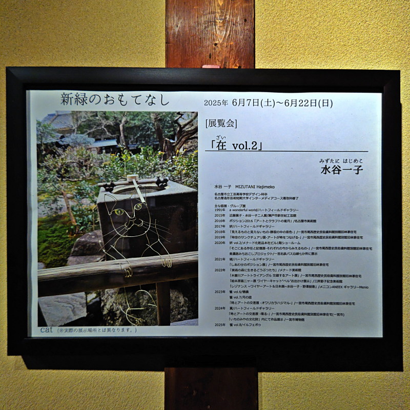 一宮市尾西歴史民俗資料館 2025年 新緑のおもてなし 【展覧会】「在vol.2」 水谷 一子(みずたに はじめこ) 会期:2025.6.7 - 6.22 ワイヤーアート作家の水谷一子さんによる、 針金の線を使った立体作品の展示です。 旧林家住宅という歴史ある建物の中で あったかもしれないひとときを表現します。