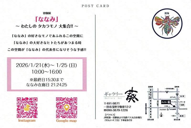 会期:2026.1.21 - 1.25 (10:00 - 16:00) [ななみ在廊日]21.24.25 会場:ギャラリー 葵 一宮市浅野字駒寄12-2(090-3879-1226)